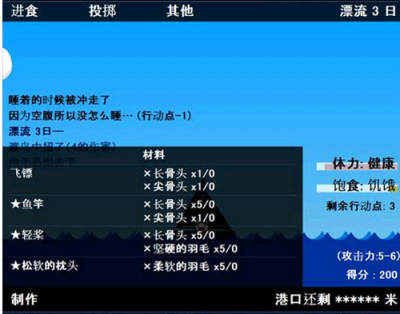 首先玩家需要在一开始保证自己的食物供给,你需要投掷天上的鸟来得到一些道具以及食物,你可以选择以鸟来作为食物,不过鸟不是每天都有,所以有时候要看运气,你也可以在凑齐材料之后按左下角制作钓竿来钓鱼。游戏前期还是比较讲究的,后期玩家熟练的同时也囤积了一定物资就不用特别担心了。