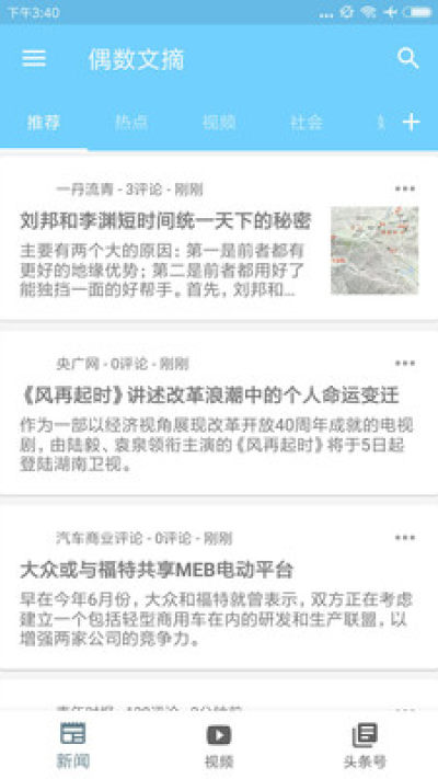 偶数文摘app是一款头条资讯平台,能够为用户提供海量的信息服务,在这里用户可以享受第一手的资讯,各种海量新闻、视频等你来看,个性化的推荐,为你推送你喜欢的内容,让你每天都逛不完,喜欢的朋友赶紧来试试吧。