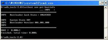重复1、2步,然后在PC的命令行窗口中输入fastboot oem get-bootinfo,将显示当前手机bootloader的状态信息,例如“Bootloader Lock State: LOCKED”,表示bootloader仍处于锁定状态,请重新进行解锁操作或者确认密码是否正确后再进行;如果显示“Bootloader Lock State: UNLOCKED”,表示手机已经解锁,可以进行刷机操作。
