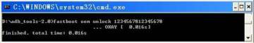 在PC机命令行窗口中输入fastboot oem unlock ****************,*号为16位解锁密码,例如:fastboot oem unlock 1234567812345678。