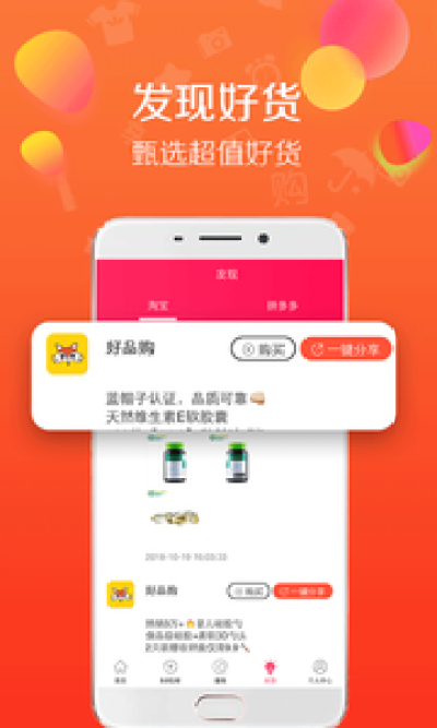 好品购 - 网购达人省钱工具!是一款基于分享经济的移动导购APP。在某宝下单平均省50%以上,分享即赚现金。做代言人更有丰富奖励等着您!海量大额优惠券每天更新,真正让你实现边省钱,边生钱。