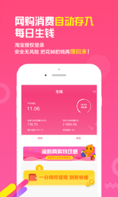 淘粉网App是专为网购用户推出省钱助手,能帮你把在淘宝、京东、拼多多花掉的钱存起来,每天可以赚取收益。