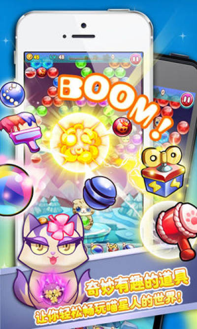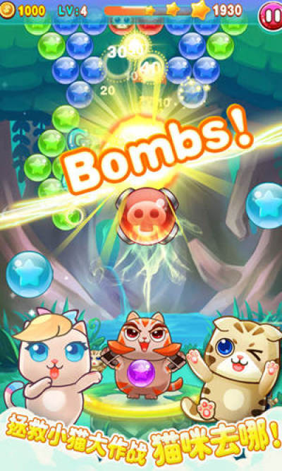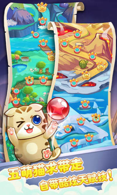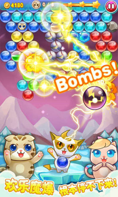 和经典游戏泡泡龙的玩法一样,点击屏幕发射彩球,三个或三个以上的同色彩球连在一起即消除。消除关卡中的所有泡泡,救下被泡泡困住的全部小猫咪就可以过关啦。