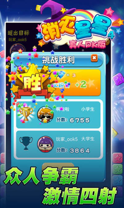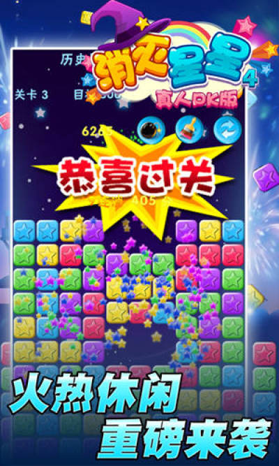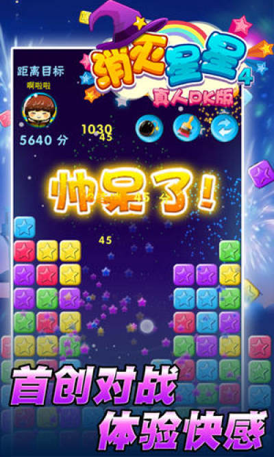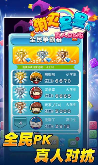 消灭星星4(真人PK版)是合肥乐堂动漫自主研发的一款消除休闲手游。比起之前的版本,游戏加入了真人PK功能,喜欢单挑吗?来吧,体验虐尽对手的快感!不够刺激,喜欢群战?来吧,众人争霸,激情四射!来自星星的挑战已经发出,小伙伴们,谁来应战?