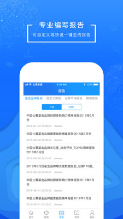 [报告]根据用户权限,会给用户提供分析师数据报告、专项事件报告、证券市场报告,及用户在PC端生成的自定义报告。