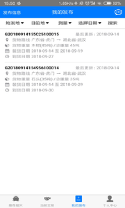 发布运输需求信息:根据用户类型可发布空船托运信息或者货物托运信息,可按照吨位,载重量,运输目的地自由匹配货物和船只;
