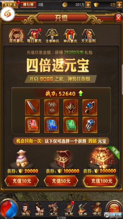 2、神兵利器、极品装备轻松获得,野外BOSS、副本爆率极高;