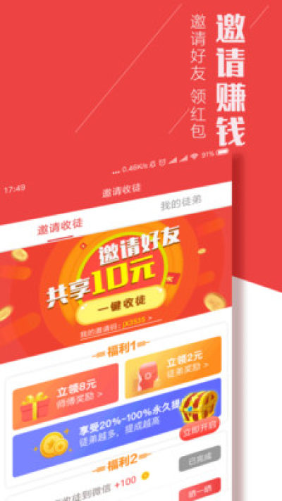 邀请好友成为你的徒弟,每次徒弟赚钱你也赚钱,别人躺赢,你躺赚!