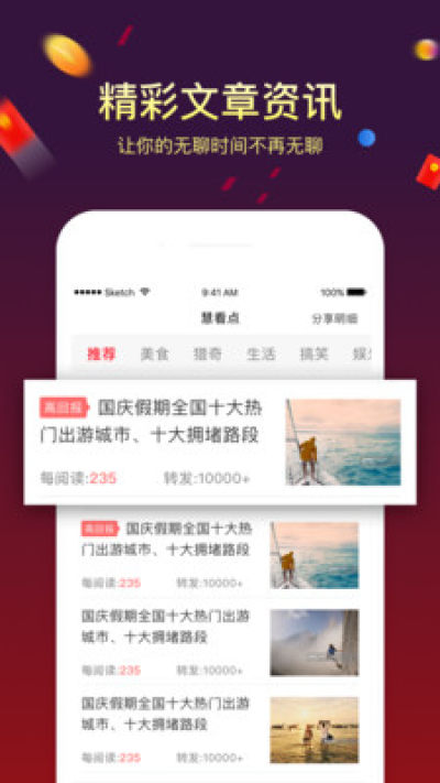《慧看点》app是一款阅读赚钱的手机平台,每日推出海量全网最新资讯内容,内容种类十分丰富,涉及日常生活和社会民生,还有搞笑的段子轻松一刻!喜欢的话就赶紧下载体验吧!