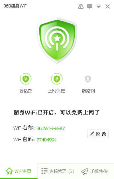360随身wifi是一款可以随身携带的无线网卡,使用起来非常方便。插在台式机上,是可以做无线网卡接收Wi-Fi上网的,作为“随身Wi-Fi”,360随身wifi的作用是把台式机或笔记本电脑的网络发射为Wi-Fi热点,可以供手机、平板或者笔记本电脑等有Wi-Fi功能的设备使用。