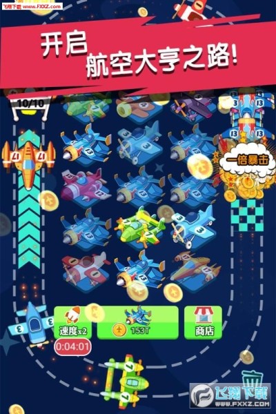 在游戏中你将拥有自己的飞机,你要驾驶着它去完成各种各样的任务,还有多种不同的飞机类型可以供你挑选,玩家需要先购买最低级的小飞机,然后把它放到飞行道上飞行,你就可以获得金币了。