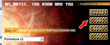 回到【Portraiture磨皮滤镜】,我们双击【keygen.exe】这个程序,打开后点击【GENERATE】,出现注册码后,我们点击【COPY】。
