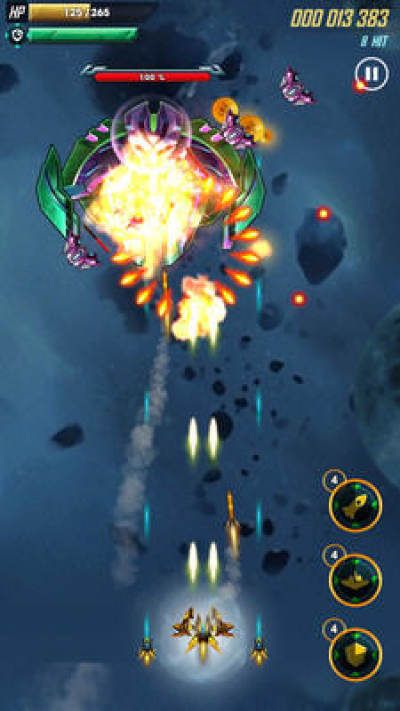 1、游戏采用经典的雷电战机类玩法,玩家在游戏中可以尽情享受飞行射击的快感哦!