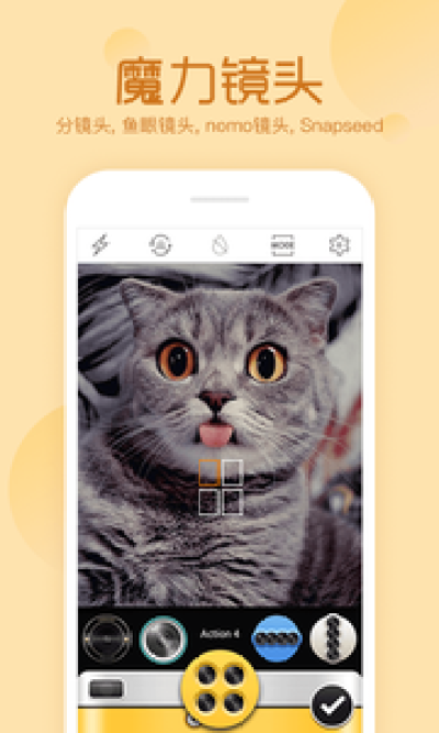 - 提供不同魔力的多种拍摄镜头,有分镜头、鱼眼镜头、nomo镜头、snapseed等