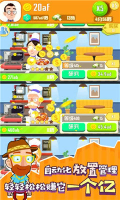 《怠速厨师安卓版》是一款卡通风格的模拟经营类手游,游戏中玩家需要经营一个自己的餐厅,收集不同的新鲜食材打造不同的菜品,赚取金钱不断开发出新的食谱,打造不同的连锁店来完成自己的食品帝国,快来下载试试吧!