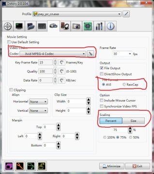 3.Scaling:录制后的解析度,默认是100%,就是你游戏解析度是1366x768 的话,那录制出来的就是1366x768,相对的影片就会比较大,所以如果你想小点就50%吧相,旁边的size就是直接指定大小啦!