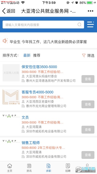 大亚湾就业app是由大亚湾区人力资源和社会保障局推出的一款针对大亚湾求职人员打造的手机找工作app,这款软件可以企业与个人双方使用,在大亚湾就业app上用户可以找工作,企业可以发布职位等等,还有最新的就业信息!