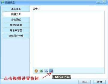 如设置视频公告,则点击“视频设置”按钮,在弹出的视频设置界面中输入视频链接之后点击“确定”即可。利用同样方式还可以在频道公告中插入图片、Flash,使频道公告更生动、活泼、引人注目。