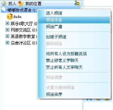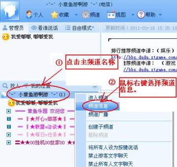 由频道创建者(OW)或者频道管理点击该频道的名称,用鼠标右键选择“频道信息”。
