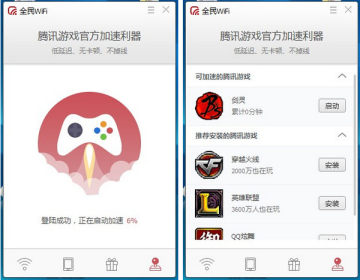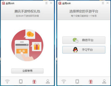 安装成功后,可以点击电脑全民WiFi客户端的礼包图标,通过绑定微信或QQ帐号,每个设备只能绑定一次,无法修改,绑定成功后即可获取相应的游戏特权礼包。