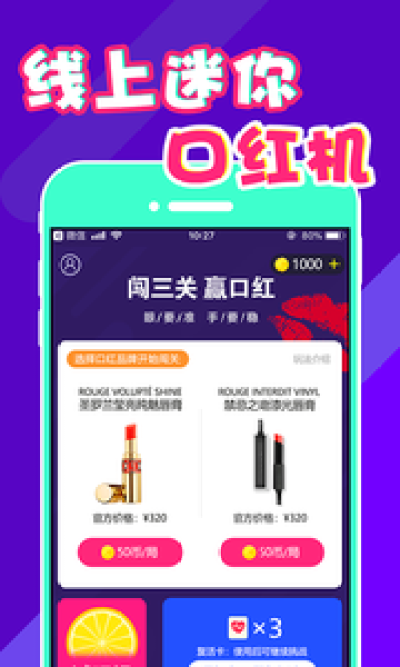 全民口红机app是一款挑战口红的软件,不用去实体店,在手机上就能够挑战口红机,相信很多小伙伴都不陌生,闯关就可以得口红,而且都是专柜同款,每个色号都有,在挑战的时候你邀请好友还可以得复活卡,感兴趣的朋友来试试吧。