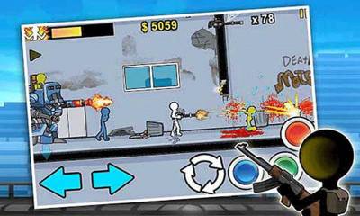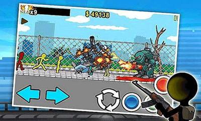 玩家要控制火柴人不断的跳跃躲避敌人的子弹,然后通过强大的火力压制敌人,游戏采用比较常见的虚拟摇杆控制,左边是方向按钮,右边是攻击以及跳跃按钮,游戏中可以购买各种武器,然后通过不断的杀敌来赚取金钱再进行升级!