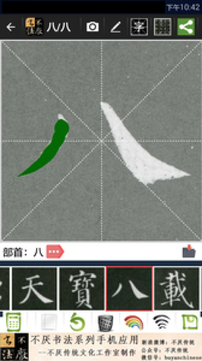 这是一个提供碑帖选择、单字放大、拍照对比,手写练习、摄像头对比临摹,并且不断成长的书法的手机应用。截止2017年底,已经四百多本碑帖供书法爱好者选择,且后续将不断制作新的碑帖并添加。彻底解放书法爱好者的书桌空间。并提供书法字典、篆刻印典、汉语字典、成语词典等工具。