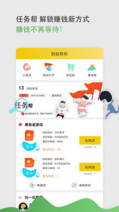 《蚂蚁帮邦》app是一款集社交和网赚的娱乐平台,在基于良好的互联网环境的基础下,开创娱乐性质的社交网赚体系,用户可以通过游戏、内容阅读、福利活动等获取收益!需要的话就赶紧下载体验吧!