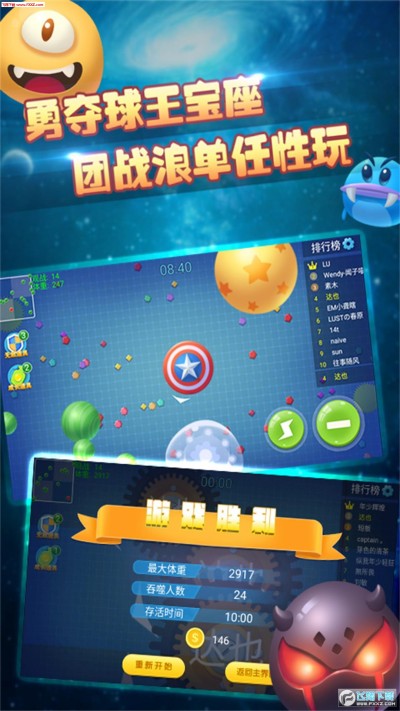 这是一个休闲与挑战并存的游戏。在这个球球的世界里,每个人都成为一颗独特的球球,发展与生存是所有人的目标,刺激战场,极限逃生,球与球的碰撞!继续疯狂的“大球吃小球”经典玩法,谁大谁说了算!