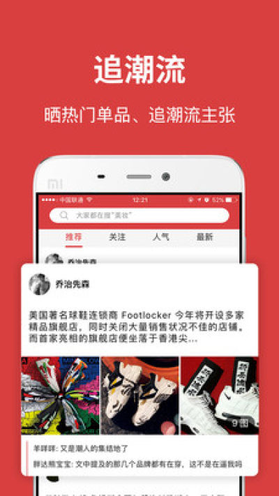 【追潮流】潮流穿搭,流行趋势,明星同款。达人们在这分享自己的潮流与品味,潮牌、大牌、轻奢、小众品牌通通晒出来。美妆、服饰、鞋履、包包、马甲线,各种的潮流主张,各种的漂亮,曹粉堆就是潮流的秀场,品味与时尚的发布区。