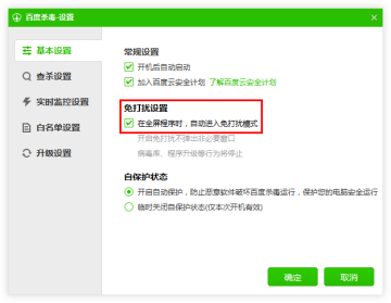 您可以在设置中心进行免打扰设置(或者右键点击托盘开启免打扰模式),勾选后百度杀毒会在全屏程序时自动进入免打扰模式。免打扰模式可以减少杀毒程序对系统资源的占用,不显示非紧急的弹窗,并延迟计划中的升级及扫描任务,使得您在进行游戏或其他全屏工作时不受打扰,在保护电脑安全的同时给您创造一个安静的办公或娱乐环境。