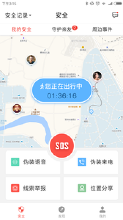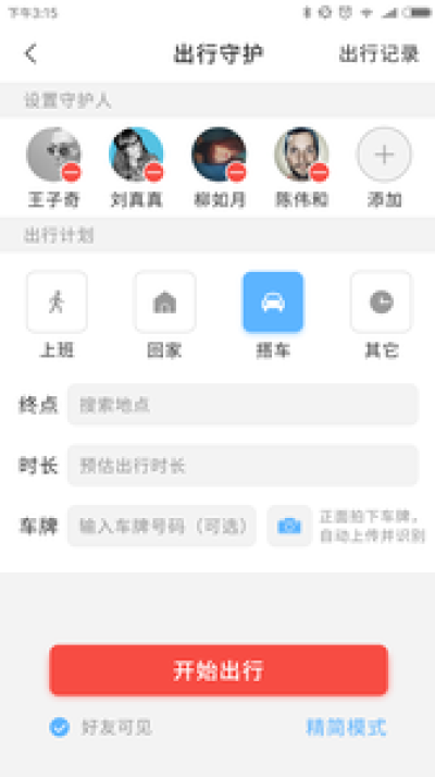 【出行守护】出门打车或走夜路时,可设置出行目的地,预估时间,记录车牌,将行程实时分享给亲友。