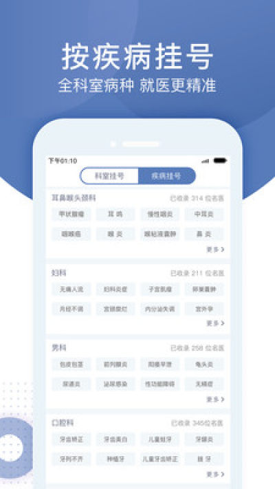 平台除了按科室挂号以外,还为不太了解病种分科的患者提供按疾病查找选择医生的导诊功能,直接选择最擅长自身疾病的医生,让挂号更简单。