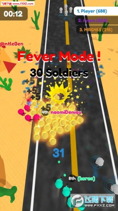 《士兵大作战安卓版》是一款快节奏的io类手机游戏,游戏中玩家们将进入战场中,控制自己的不同颜色的军队在场景中战斗,收集场景中无颜色的士兵来不断壮大的自己的阵容,和敌人对战消耗士兵击败对手赢取分数,喜欢的小伙伴快来一起战斗吧!