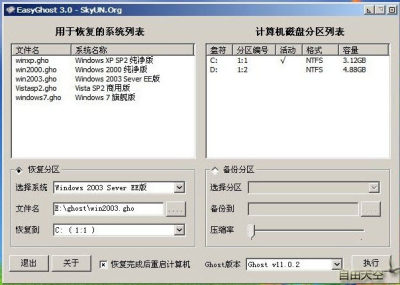 3:EasyGhost 有强大的自定义功能,通过INI文件,可指定您U盘、光盘、硬盘中的多个基于GHO的系统(数量不限)到列表中,使之方便一键恢复指定系统到硬盘,当然,也可在界面中手动选取没有在INI文件中指定的,需要恢复的GHO文件(比如硬盘上以前备好份的GHO文件)。EasyGhost3还可以通过INI文件来指定不同的版本,任意路径的GHOST32.EXE程序,为EasyGhost3调用。恢复与备份调用的GHOST32.EXE可为不同版本的GHOST32(我一般用GHOST8.3用于备份,GHOST11.02用来恢复),备份可设置不同的压缩率。