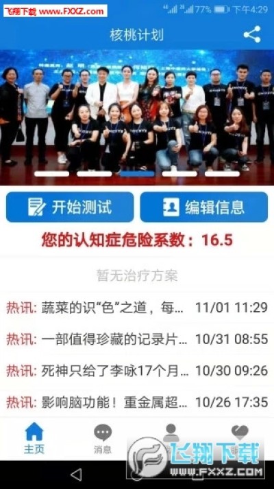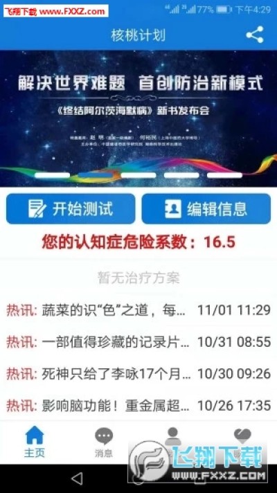 核桃计划app是一款针对老人健康打造的手机app,这款软件也是为了给用户提供关于防止AD俗称老年痴呆的病症,在核桃计划app上可以线上检测也能推荐线下的专业机构给你治疗等等,私人定制服务哦,快来下载吧!