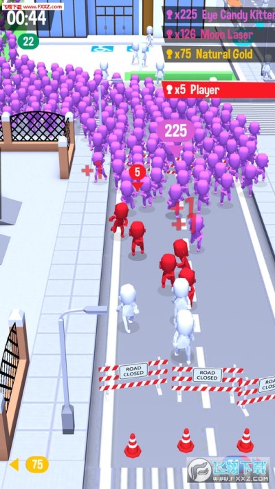 1、游戏中玩家可以选择不同的颜色的人群加入战斗,自由召集人群,来和对手对抗,不断吞噬比你小的人群。