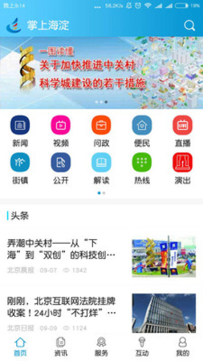 掌上海淀,以海淀区的新闻为主,通过文字、视频、图览的形式进行展示,还包括政务服务、生活服务和其他服务类型,而且对身边的新闻可以随时进行爆料。