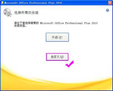 需要选择所需的安装类型提示,有两个按钮:”升级”与“自定义”。升级顾名思义就是为原本你电脑有安装的PPT版本升级为更高的版本。我们点击“自定义”按钮。