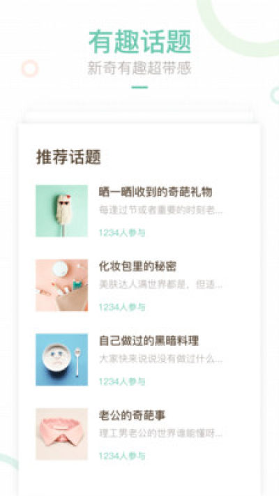 大家都在讨论的,新鲜出炉的话题,明星八卦、居家Tips,生活趣事全都有,等你来说事儿。