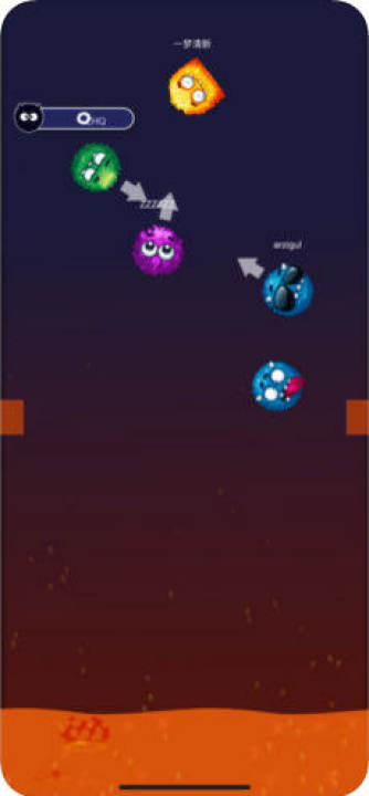 1、手指按住屏幕改变方向并蓄力,松开手指即可弹射,碰撞其他玩家, 直到他被顶入下方滚烫的岩浆。