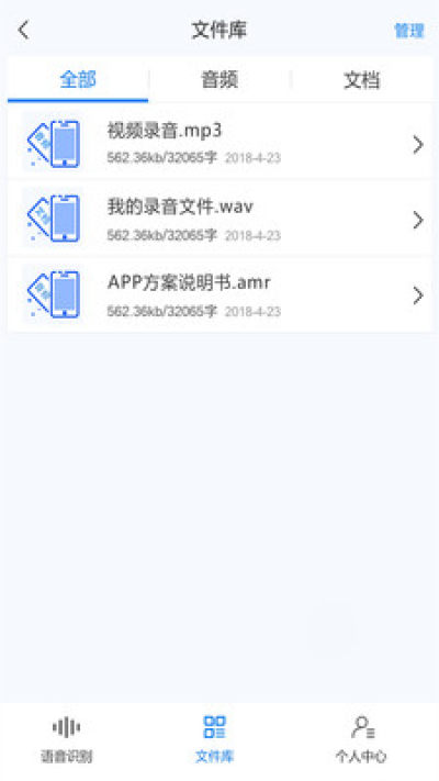 提供保存录音音频、识别文本、翻译文本为音频文档,办公文档功能,可分享文档至微信、 QQ等社交软件,支持文档管理,分享功能。