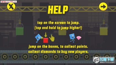 2、控制小人不断跳跃即可躲避危机,但是你也需要控制小人踩到盒子才能得分;