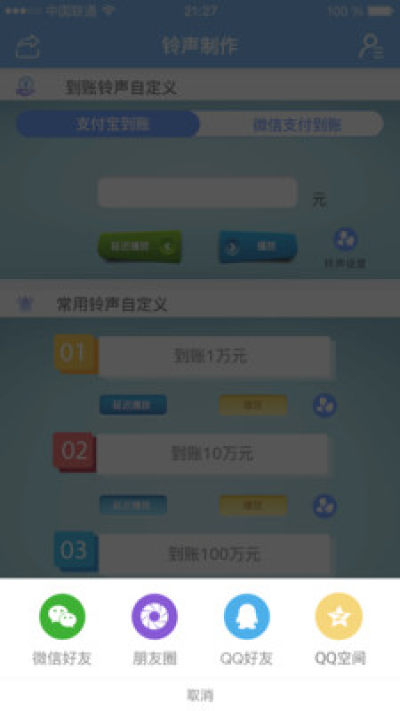 用户可以根据自己喜欢的金额设置自定义到账铃声播放,还可以设置手机来电铃声,短信通知铃声,闹钟起床铃声三种模式。让你在约会,看电影,见丈母娘,朋友面前充满气场。软件内部还增加了幸运抽奖功能,如果你足够幸运的话还可以获得免费使用软件的机会和更多幸运大奖哦。还在等什么赶快下载吧。