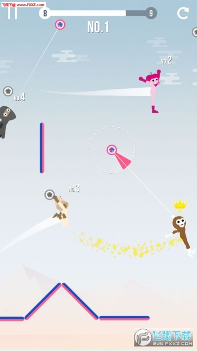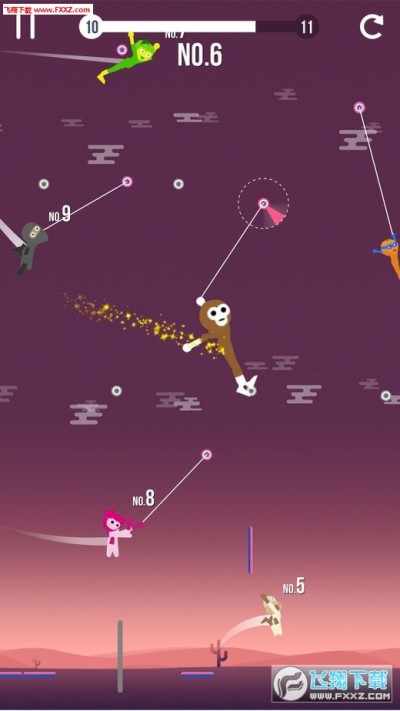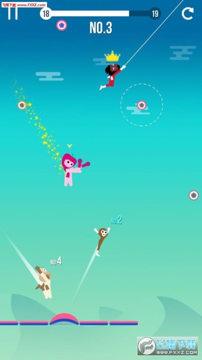 这款游戏的玩法非常新颖,玩家要利用绳子以及摆动的惯性进行飞行,先到达终点的玩家将获得胜利;