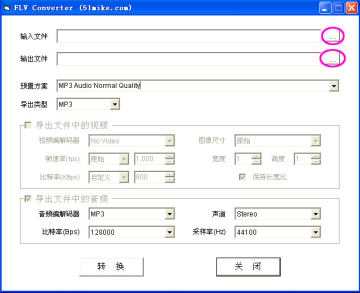 c. 单击“输入文件”旁边的小框,选择一首你想要转换格式的Flv歌曲;再单击“输出文件”旁边的小框,指定歌曲转换后保存的路径和文件名,如下图: