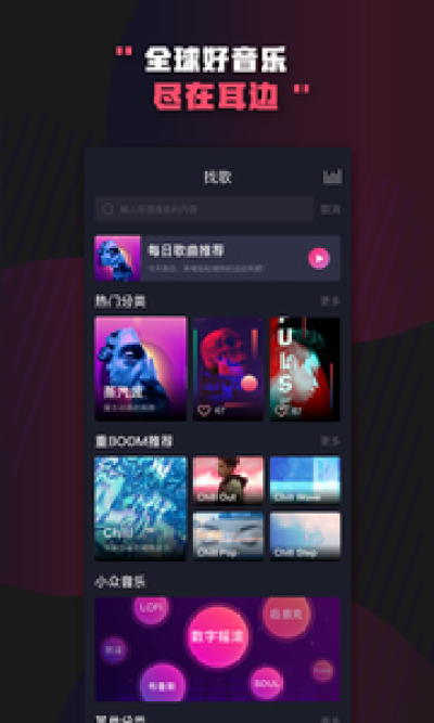 Boom音乐是一个优质的听歌平台,海量优质的音乐资源,各种风格的音乐这里都有,满足不同用户的听歌喜好,Boom音乐APP的功能分类清晰,使用起来更方便,你可以在这里快速的找到新的音乐,快下载使用吧。