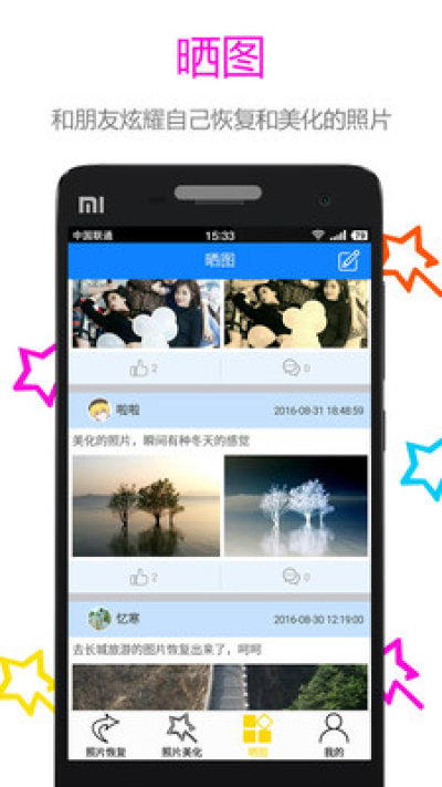 【晒图】晒图功能,发布自己恢复照片的心得体会,发布自己美化的图片和教程,和用户一起交流照片恢复和照片美化技巧。