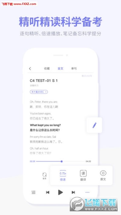 2.听力精听精读 精听模式训练,细分材料话题,支持逐句精听、音频变速、随机播放、无限循环,可实现四种间隔、五种倍速任意调节。单句反复练习,迅速提升听力水平。