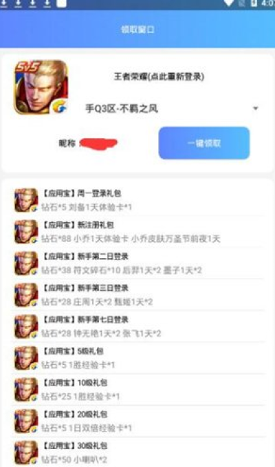 一键领取游戏中心每日礼包,支持24款游戏,包含:王者荣耀、刺激战场、CF手游、QQ飞车、全民出击、斗地主等!